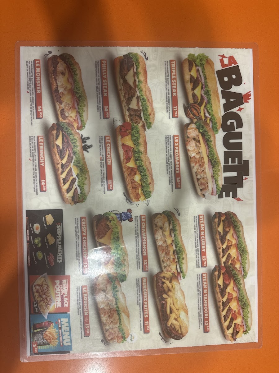 The menu features a variety of fast food options, including a selection of burgers, poutines, and desserts. It is organized into several key groups to help guests navigate their choices easily.