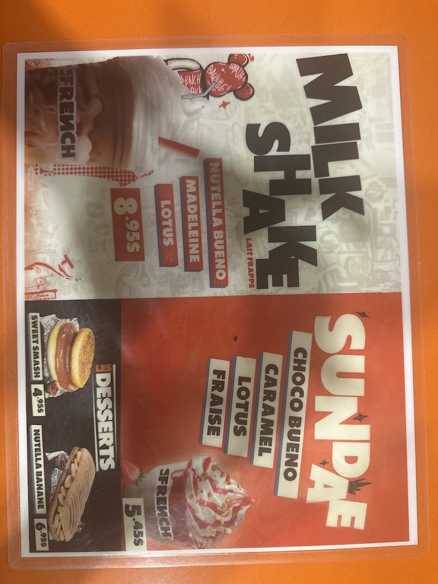 - Desserts: The dessert menu includes sundaes in a variety of flavors such as caramel, strawberry, chocolate Bueno, and Lotus Speculoos. Milkshakes featuring Nutella and Lotus Speculoos are also offered. Additionally, a sweet burger-style item with Nutella on brioche is available.